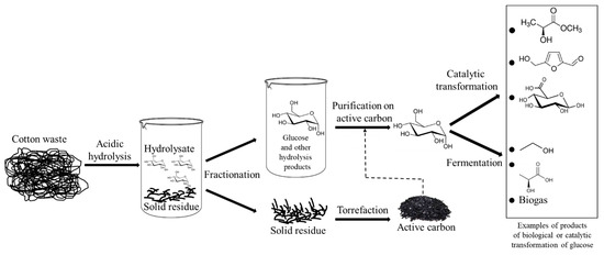 Figure 1 shows a process for treating cotton waste, including textiles with synthetic additives (polyester and polyamide). It is based on acid hydrolysis of cellulose and further biological or catalytic transformation of the glucose into useful chemical products. Only some of the products that can be obtained from glucose are indicated in the diagram. A very important product for ensuring a waste-free process is activated carbon, which can be made from the solid residues after hydrolysis of cotton waste. The activated carbon may be used in the process itself to purify the hydrolysate from fermentation inhibitors or sold as a commercial product. Research efforts at Lodz University of Technology to torrefy the solid residue of cotton fibers after hydrolysis have shown that activated carbon with a high specific surface area (>500 m2/g) can be produced, which is capable of adsorbing the non-sugar components of hydrolysates. Lactic bacteria and yeast were successfully multiplied on hydrolysates purified on a bed of activated carbon produced from cotton waste. This research is ongoing and will be the subject of forthcoming publications.