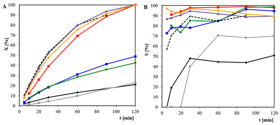 Catalytic results were expressed as the conversion degree (X, %) and selectivity (S, %), defined as: