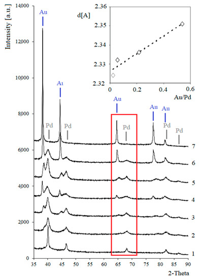 X-ray diffraction patterns for Pd-Au/SiO2 catalysts: (1) 5% Pd/SiO2; (2) 5% Pd-0.2% Au/SiO2; (3) 5% Pd-0.5% Au/SiO2; (4) 5% Pd-1% Au/SiO2; (5) 5% Pd-2% Au/SiO2; (6) 5% Pd-5% Au/SiO2; (7) 5% Au/SiO2 and the linear relationship of interplanar distances in the composition function of these systems (Vegard’s rule). The bimetallic catalysts were activated in a hydrogen atmosphere for 2 h at 300 °C. Adapted from ref. [29].