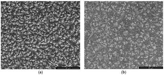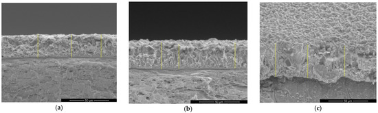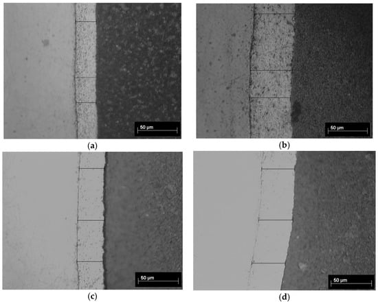 Cross-section images obtained with an optical microscope showing the coating thicknesses are presented in Figure 2a–d and cross-section images obtained with SEM are presented in Figure 3a–c.