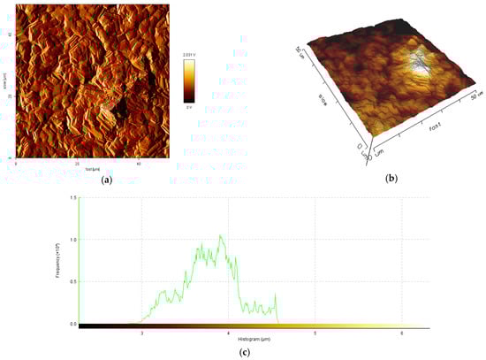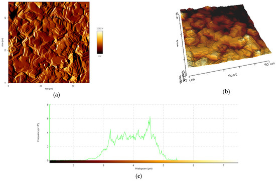 50 × 50 μm2 Atomic Force Microscopy (AFM) images of sample A: (a) 2D image; (b) 3D image; (c) histogram of the scanned surfaces.