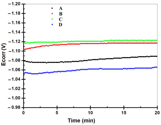 The results obtained for the changes of the open-circuit potential values of all tested samples are presented in Figure 8. The results obtained indicate a corrosion potential range from −1.05 V to −1.12 V, variation of the corrosion potential in time being very slow. A thorough examination reveals that the curves of corrosion potential, known as open circuit potential, vs time appears nearly straight, indicating that steady state potential is created. Furthermore, it can also be seen that for hybrid coatings obtained at 50 mA/cm2 and epoxy resin particles with mean diameter size of 6–10 μm, open circuit potential (OCP) versus time curves shifted towards the more positive (anodic) direction.