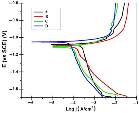 The polarization measurements were carried out in the potential range from −1.7 to −0.6 V using a corrosive medium of 0.5 M sodium chloride solution. The Tafel plots of tested samples are given in Figure 9. The corrosion parameters such as corrosion potential (Ecorr), corrosion current density (jcorr), corrosion rate (CR) and anodic/cathodic Tafel slopes (βa and βc) derived from the slope of the curve according to the Stern-Geary equation [27,28] are tabulated in Table 5.