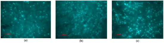 To describe the bacterial attachment on the coating surfaces, the fluorescence observations were performed on samples. Attachments of bacteria on different surfaces create a biofilm formed by microbial aggregates and extracellular polymeric substances (EPS) including exopolysaccharides, proteins and DNA. The production of EPS is important for the survival and development of biofilm that will influence the corrosion of the surface on which the bacteria are attached. The blue light points/areas in the fluorescence images in Figure 10a–c represent the bacteria bodies/colonies attached to the surfaces.