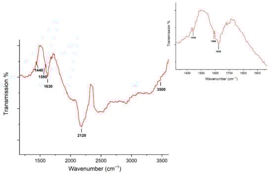 The irregularity of the electrode surface could be attributed to the formation of enzyme–enzyme conjugates, which can be formed during the immobilization process due to excessive cross-linker concentration that activates the carboxylic groups within enzymes as well as those from the alkanethiols []. These enzyme–enzyme conjugates are formed by the cross-linking between the side chains of the proteins’ amino acids by forming covalent bonds between them []. In particular, laccase enzymes are rich in amine groups from lysine residues and carboxyl groups from glutamic and aspartic acid, which are capable of interacting as suggested by Addorisio et al. []. The FTIR spectroscopy characterization of the immobilized gold surface (Figure 3) exhibited the characteristic bands of amide I at 1580 cm−1 (NH, bending) and 3500 cm−1 (NH, stretching), amide II at 1630 cm−1 (C=O, stretching), and the symmetric stretching of carboxylates vibration at 1440 cm−1 []. According to Schartner et al., these bands’ presence confirms the proteins’ immobilization through lysine side chains []. On the other hand, an additional signal was observed at 2120 cm−1, commonly attributed to the carbodiimide group (N=C=N, stretching) of the EDC cross-linker. This band’s presence suggests that some functionalized surface sites remained activated and without enzymes []. Once the immobilization process concluded, the enzymatic activity of immobilized laccase was measured and compared to the initial activity of 100 U·mg−1, obtaining a 34% loss in the free enzymes’ oxidation activity. The decay in the enzymatic activity after an immobilization process is well known and has been attributed to non-oriented covalent immobilization of the enzyme that blocks the molecule’s active site []. The loss of enzymatic activity obtained in our work was similar to that reported by Fan et al. 2017, where an esterase lost 40% of its activity after its immobilization on silica, using a similar method based on the formation of covalent bonds [].