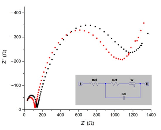 Once the electrode fabrication was completed, electrochemical impedance spectroscopy (EIS) was performed to analyse the conductivity of the modified electrode. Figure 4 shows the impedance features of both bare and immobilized electrodes. From this information, an equivalent circuit was simulated for the working electrode (Figure 3 inset). The equivalent circuit consisted of an electrolyte solution resistance (Rel) parallel with a double layer capacitance Cdl and a charge electron-transfer resistance Rct, which is in series with Warburg impedance (W), which indicates the diffusion of the ionic species through the diffusion layer []. The bulk properties of the electrolyte solution and diffusion of the redox species in solution are represented in Rel and W, which were affected by the enzyme immobilization at the electrode surface. This array increments the resistance from 20 to 30 Ω and diffusion from 0.0012 to 0.0015 S·*√s (see Table 1).
