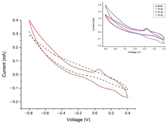 Voltammetric profile of Lac-Au working electrode (black dotted line: scan in phosphate buffer solution (PBS); red line: measurement in PBS with 3-PBD). Inset: voltammetric profile in PBS with 15, 25, and 35 µM of 3-PBD.