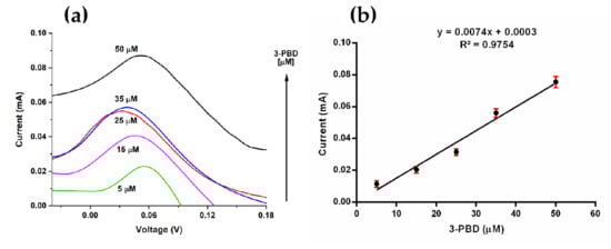 When 3-PBD was added to the working solution, the current of the oxidation peak increased linearly and proportionally to the concentration ranging from 5 to 50 µM (Figure 6a), following the equation I(mA) = 7.4 × 10−3 c + 3.0 × 10−4 [µM] with a correlation coefficient of 0.975 (Figure 6b).