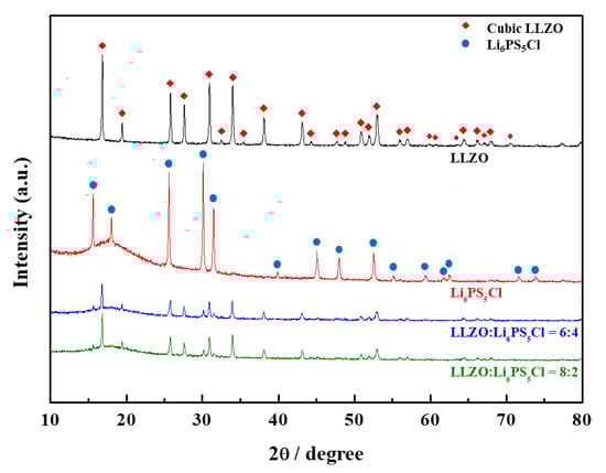 In this study, the sulfide electrolyte was argyrodite (LPSC), which has a much higher ionic conductivity (~10−3 S·cm−1) than that of LLZO (10−7 S·cm−1). In addition, the relative density of the composite electrolytes increased significantly with respect to the LPSC weight fraction. Thus, the space-charge effect or possible interaction between LLZO and LPSC may be counteracted by the increase in the highly conductive and dense LPSC phase.