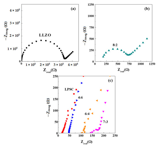 Impedance spectra of symmetrical cells with solid electrolytes (a) of LLZO, at (b) LLZO:LPSC = 8:2, at (c) LLZO:LPSC = 7:3, 6:4, 4:6, and of LPSC.