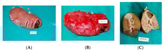 Macroscopic appearance of the kidneys on day 7 (A) and 14 (B,C) after surgery: (A) partially healed wounds after (from the left side) incision with DL, TDFL, and partial nephrectomy with TDFL. (B) A small recess shown in a kidney after partial nephrectomy on day 14; and (C) a cystic wedge-shaped lesion visible after cutting the organ in a long axis on day 14.