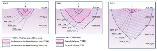 Both lasers used in our experiment produced moderately narrow superficial zones of thermal damage immediately after surgery, on day 7, and on day 14. However, when comparing the total zones of thermal damage, the DL produced deeper tissue damage. Considering that the bleeding with both lasers was comparable and that the TDFL tended to ensure better hemostasis, it can be assumed that the deeper tissue damage by the diode laser is unfavorable. In our previous reports, we have shown that the thulium-doped fiber laser can efficiently cut parenchymal organs in pigs (i.e., liver and spleen), while producing minimal zones of thermal damage sufficient for hemostasis (maximum depth: 1157.5 μm on day 7 for spleen and 1818.7 μm on day 7 for liver) [26,27].