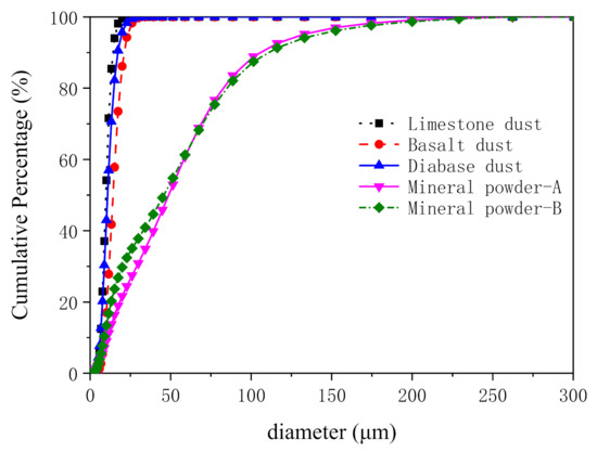 (1) As the production process is the same, compared with the normal mineral powder, the particle sizes of different types of dust in the project are similar and finer. The average particle size of the dust in each aggregate was approximately 20% that of the mineral powder. The particle sizes of the dust contained in each aggregate were evenly distributed, whereas the mineral particle sizes differed relatively significantly. The specific surface area of the dust in each aggregate was approximately nine times that of the mineral powder.
