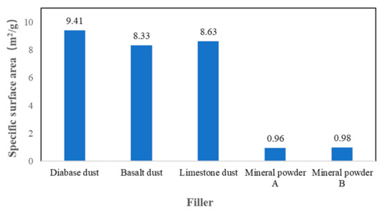 Figure 4 shows the specific surface area measurements for the diabase dust, basalt dust and limestone dust and for the two types of mineral powder. The average specific surface areas of the diabase dust, basalt dust and limestone dust were on average 9.70, 8.59 and 8.90 times that of the two types of comparative mineral powder, respectively. Clearly, the three types of dust each had a significantly higher specific surface area than that of the two types of mineral powder.