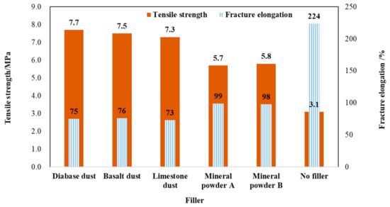 Figure 7 shows the tensile test data for the EA mastic samples. The data demonstrate that the fillers significantly enhanced the tensile strength of the EA mastic. Specifically, on average, the dust-containing EA mastic samples possessed a tensile strength approximately 30% higher than that of the mineral-powder-containing EA mastic samples. The dust-containing EA mastic samples presented an elongation at break approximately 25% lower than that of the mineral-powder-containing EA mastic samples. However, both the dust-containing and mineral-powder-containing EA mastic samples exhibited a relatively high elongation at break (>70%). The three types of dust differing in lithology yielded basically similar tensile strength values, suggesting that fineness was the primary factor affecting the tensile strength of the EA mastic and that dust lithology had no significant impact on the tensile strength of the EA mastic. As the production process is the same, compared with the normal mineral powder, the particle sizes of different types of dust in the project are similar and finer. The experiments show that the difference in fineness modulus between the powders and the dust is significant. Considering that the dust lithology showed no significant impact on the tensile properties of the EA mastic and that the three types of dust displayed similar particle size distributions, only the diabase dust, which is commonly used in steel bridge deck epoxy asphalt pavements, was used in the subsequent comparative tests between the EA mastic and mixture.