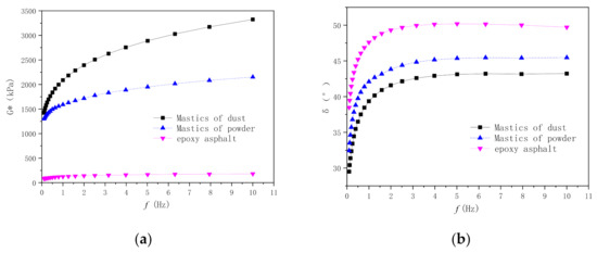 (1) Figure 8 shows the test curve data. As demonstrated in Figure 8, the complex shear modulus (G*) of the mastic increased significantly after adding a filler; however, the relatively fine dust more significantly increased G*. Additionally, the phase angle (δ) decreased substantially after adding a filler, suggesting that the filler significantly improved the elasticity of the mastic; similarly, the relatively fine filler more significantly improved the elasticity of the mastic.