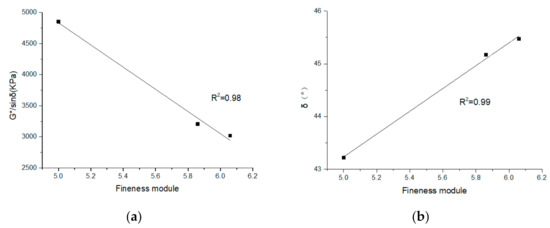 (2) The rutting factor (G*/sinδ) and δ of the EA mastic samples at 60 °C and 10 Hz and the fineness modulus of the fillers were subjected to statistical regression analysis. Figure 9a shows that the G*/sinδ of the EA mastic decreased linearly as the fineness modulus increased, indicating that the relatively fine filler significantly improved the rutting factor of the EA mastic. Figure 9b shows that the δ of the mastic increased linearly with the fineness modulus (an empirical quantity obtained by adding the total percentage of the sample of a filler retained on each of a specified series of sieves, and dividing the sum by 100), indicating that the relatively fine filler considerably improved the elasticity of the EA mastic.