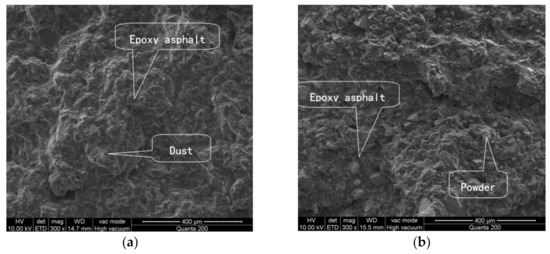(2) The SEM microanalysis shows that the EA mastic samples containing relatively fine dust formed a tighter and denser interfacial bonding structure, which significantly improved the compactness of the network structure of the EA mastic and reduced its internal microdefects.