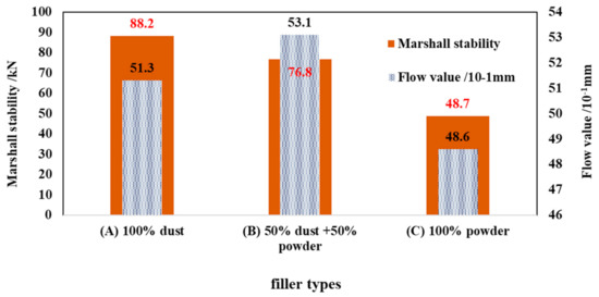 Figure 12 shows the Marshall test results for the EA mixture samples. The results demonstrated that the EA mixture sample prepared based on scheme (A) yielded the highest Marshall stability, followed by those prepared based on scheme (B) and scheme (C). Specifically, on average, the EA mixture sample prepared based on scheme (A) revealed a 73% higher Marshall stability than that prepared based on scheme (B). Additionally, there was no notable difference in the flow value between the EA mixture samples prepared based on schemes (A) and (B), suggesting that, compared with the mineral powder, the relatively fine dust significantly enhanced the strength of the EA mixture.