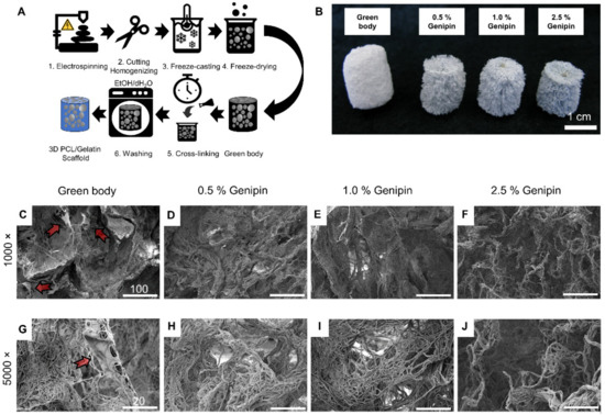 Preparation and morphology of 3D PCL/gelatin scaffolds. (A) Schematic illustration of the fabrication process. (B) Influence of different cross-linker concentrations on scaffold color and morphology, scale bar = 1 cm. (C–J) SEM images of cross-sections: (C,G) scaffolds prior to cross-linking (green body), arrows show polymer sheets in-between the fibers and cross-linked with 0.5% (D,H), 1.0% (E,I), and 2.5% genipin (F,J); (C–F) scale bar = 100 µm, (G–J) scale bar = 20 µm.