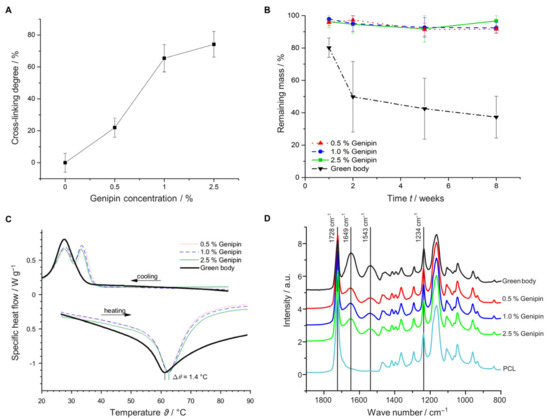 Characterization of scaffolds with different cross-linker concentrations (0.5%, 1.0%, and 2.5% genipin) and the non-cross-linked control (green body). (A) Cross-linking degree (). (B) Degradation study in buffer solution for 8 weeks. (C) DSC measurements. (D) ATR-FTIR analysis.