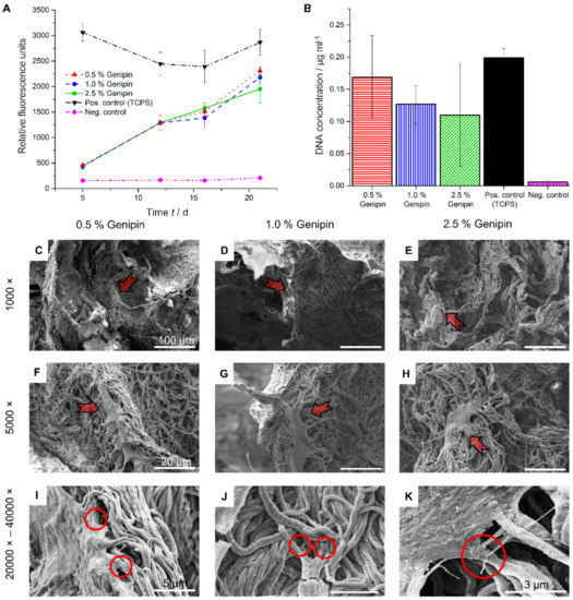Cell viability and cell morphology on scaffolds. (A) Metabolic activity measurements of HDF at various time points using the PrestoBlue assay. (B) DNA quantification at day 23 using the PicoGreen assay. (C–K) SEM images off the cell morphology at the end of the incubation time (day 23), arrows indicate adhering HDF. (C,F,I) Scaffolds cross-linked with 0.5% genipin. (D,G,J) Scaffolds cross-linked with 1.0% genipin. (E,H,K) Scaffolds cross-linked with 2.5% genipin. (C–E) Scale bar = 100 µm, (F–H) scale bar = 20 µm, (I,J) scale bar = 5 µm, (K) scale bar = 3 µm.