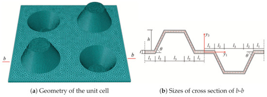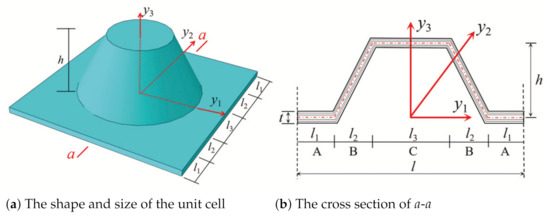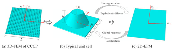 The equivalent model of CCCP can be established from the perspective of energy concept. Due to the periodicity of the CCCP along the two axes of the plane, a square plate with conical convexity is taken as a typical unit cell as shown in Figure 2b. The length, height, and thickness of the unit cell are l, h, and t, respectively. That is, the analysis of the original CCCP is decomposed into a microscopic analysis of the unit cell (providing effective plate properties) and macro analysis of 2D-EPM as shown in Figure 2c.