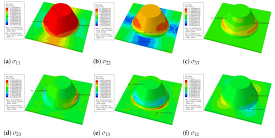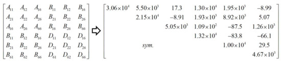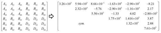 The geometrical sizes of unit cell are: h = 10 mm, t = 1.0 mm, = 5 mm, = 5 mm, = 10 mm, periodic length l = 60 mm. The material properties and boundary conditions are the same as those in Section 3.1. The equivalent stiffness matrix of the bidirectional CCCP obtained by the present model is shown in Figure 16 for reference.