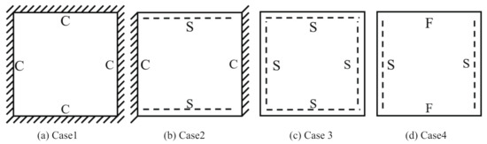 Four boundary conditions used in the static analysis of CCCP: (a) CCCC, (b) CSCS, (c) SSSS, and (d) SFSF, with C denoting clamped support, F for free support, and S for simple support.