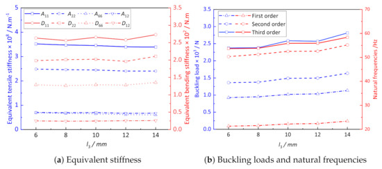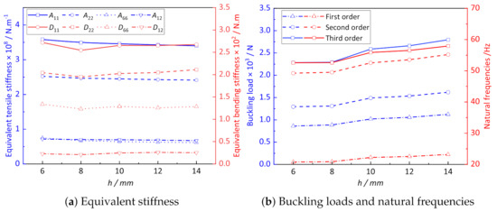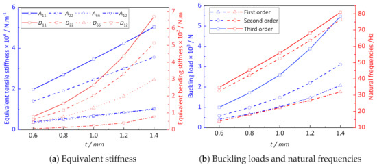 Figure 12a shows the influence of thickness t on the equivalent stiffness of CCCP. It can be seen that the equivalent tensile stiffness of CCCP increases linearly with the increasing thickness t, while the equivalent bending stiffness increases nonlinearly, which has a great influence on the buckling load and natural frequency of CCCP as shown in Figure 12b. The reason is that with the plate thickness t increases, the orthogonality of CCCP becomes non-obvious.