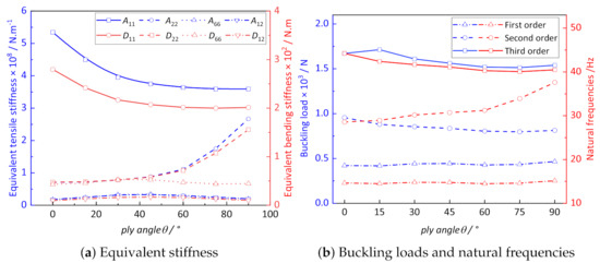 Figure 13a shows the influence of ply angle on equivalent stiffness of CCCP. It can be observed that the curves of and show a nonlinear downward trend with the increase of the ply angles, while the curves of and show a small increase between ply angles of and , and a nonlinear increase between ply angles of and . It can be observed from Figure 13b that the influence of ply angle on buckling load is not obvious, while the second-order natural frequency reaches the maximum value when ply angles is .