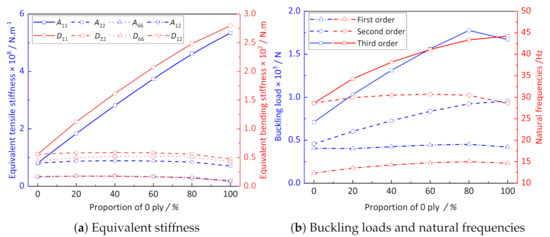 In this section, CCCP with the combination of and ply is adopted to study the influence of the proportion of ply on the effective stiffness, buckling, and natural frequencies. It can be observed from Figure 14a that the values of and gradually increase with the increase in the proportion of ply, while other stiffness gradually decrease. The buckling load of CCCP in Figure 14b gradually increases with the increase in the proportion of ply, and reaches its maximum value when the proportion of ply is 80%. The first two natural frequencies of CCCP increase and then decrease with increasing of the proportion of ply. Therefore, the buckling resistance of CCCP can be improved by optimizing the layup configuration in engineering application, so that the effective plate properties of CCCP can be brought into full play.