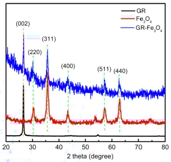 Fe3O4 is a black crystal with magnetism, commonly known as magnetic iron oxide, which is a complex oxide. The ferromagnetic material prepared has typical Fe3O4 diffraction peaks. As shown in Figure 1, the positions at 30.1°, 35.4°, 43.1°, 56.9°, and 62.5° correspond to the diffraction peaks (220), (311), (400), (511), (440) of Fe3O4, respectively []. GR has a characteristic peak of (002) at 26.5°. Additionally, the prepared magnetic GR was also characterized by XRD, and it was found that the characteristic peaks of GR and Fe3O4 existed at the same time, indicating that GR-Fe3O4 was successfully prepared. To determine whether Fe3O4 and GR was chemically bonded, FTIR characterization was performed.