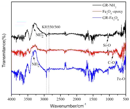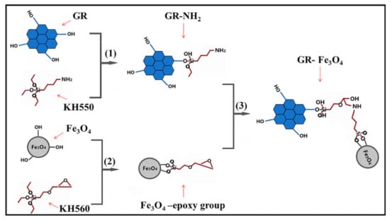 Firstly, GR (0.3 g) was dispersed in ethanol (60 mL), then KH550 (3 mL) and HCl (1 mL) were added. The mixed solution was stirred in an oil bath at 55 °C for 5 h to obtain GR-NH2 after suction filtration and ultrasonic dispersion. FeCl3·6H2O (2.0 g) and FeCl2·4H2O (0.74 g) were dissolved in deionized water (20 mL). An appropriate amount of NaOH was added to make the pH value of the solution within the range of 10–11, and the mixed solution was stirred in an oil bath at 55 °C for 2 h []. Then, the intermediate products obtained by filtering the above solution were added to a mixed solution of ethanol (30 mL), KH560 (1 mL) and HCl (1 mL), and stirred in an oil bath at 55 °C for 5 h. After filtration, the Fe3O4-epoxy group was obtained. Finally, GR-NH2 and Fe3O4-epoxy (mass ratios are 8:1, 4:1, 2:1, respectively) were added into ethanol (60 mL) and stirred in an oil bath at 60 °C for 10 h. The mixed solution was filtered to obtain magnetic GR.