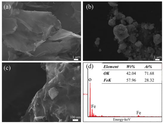 Figure 4 shows the SEM morphology of GR, Fe3O4, GR- Fe3O4, and EDS of GR-Fe3O4. The surface of GR has an obvious fold structure, as shown in Figure 4a. Figure 4b shows the SEM morphology of Fe3O4. Since the SEM resolution is lower than TEM, it is impossible to determine whether it is a single Fe3O4 particle. There are many small particles attached to the GR, as shown in Figure 4c. EDS characterization test was performed on the particles on magnetic GR, which is depicted in Figure 4d. Element peaks associated with iron and oxygen are detected, indicating that Fe3O4 particles loaded on the GR sheet.