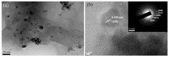 The prepared magnetic GR was further observed by TEM. As shown in Figure 5, Fe3O4 particles are evenly distributed on the GR flakes. The ones with lattice fringes at high magnification are Fe3O4, and the diameter of a single crystal grain is in the range of 15–20 nm. The electron diffraction patterns are (220), (311), (400), (511), and (440), respectively, indicating that the chemical bonding of GR and Fe3O4 did not change the crystal structure of the Fe3O4 particles.
