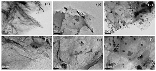 TEM images of GR-Fe3O4 under different mass ratios, the mass ratios of GR: Fe3O4 are 8:1 (a,d), 4: 1 (b,e), 2:1 (c,f).