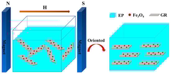 Epoxy resin (EP) sealing materials are widely used in the field of electronic packaging due to their excellent electrical insulation and mechanical properties. However, the heat-conducting property of EP is very poor, and the intrinsic thermal conductivity is only 0.18 W/mK []. With the development of miniaturization of electronic equipment, the phenomenon of heat generation becomes more and more serious, which will greatly shorten the service life of the equipment []. Therefore, improving the thermal conductivity of EP is an efficient technical means to solve this problem. At present, several conductive particles (SiC [,], Al2O3 [,,], AlN [,,,], and SiO2 []) are used to improve the thermal conductivity of EP. However, the improvement effect is not obvious. To effectively improve the heat dissipation rate of EP, the suggestion of constructing a heat conduction channel by adding graphene (GR) to an EP matrix has been proposed. Because of the extremely high thermal conductivity of GR in the in-plane direction, it is crucial to ensure the directional distribution of GR in an EP matrix. There are many methods to achieve directional distribution of GR in an matrix, including the flow shear induction method [], solution pouring method [], vacuum dead-end microporous filtration method [], vacuum pumping filtration method [], and the magnetic field induction method []. The magnetic field induction method refers to the directional arrangement of magnetic GR in a magnetic field, which is widely used because of its safety and simple operation. Therefore, the preparation of magnetic GR is a goal that researchers have been exploring. Zhu successfully loaded magnetic nanoparticles on the surface of GR via chemical co-precipitation []. Ma prepared GR loaded with Fe3O4 nanoparticles using a decomposition reduction method []. Guo used polyelectrolyte coating technology to coat Fe3O4 nanoparticles on the surface of GR []. Although magnetic particles can be loaded on the surface of GR using different methods, this structure is not sufficiently stable.