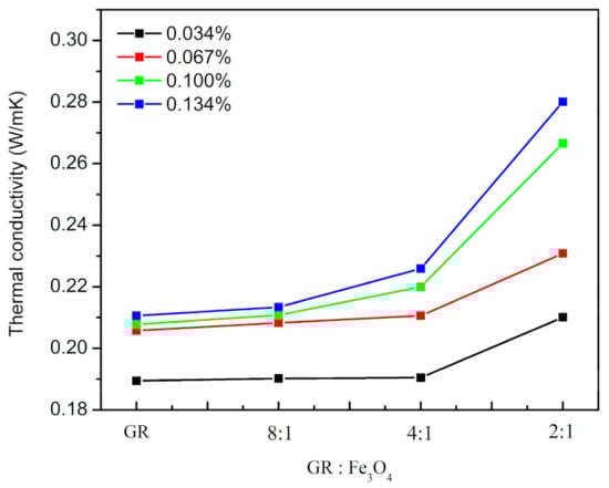 As shown in Figure 8, on the premise of the same degree of GR orientation, that is, the mass ratio of GR and Fe3O4 remains unchanged, the thermal conductivity increases gradually with the increase of GR content. This can be inferred from the fact that smaller content of GR tend to be wrapped by the EP and isolated from each other. With the increase of GR content, the heat transfer pathway is formed in the EP and the thermal conductivity increases.