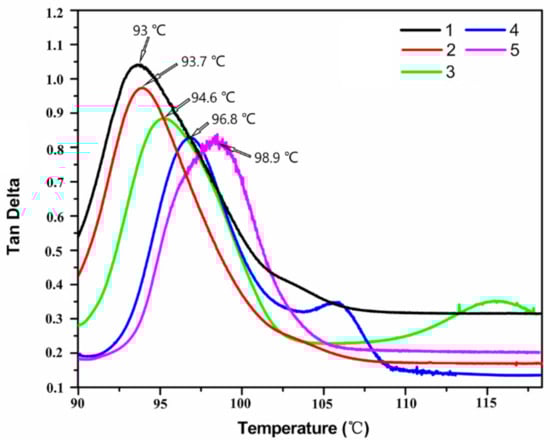 Dynamic thermomechanical analysis spectra of composites as a function of temperature with different magnetic GR contents. Curves 1–5 indicate that the mass fraction of magnetic GR in EP is 0.00%, 0.05%, 0.10%, 0.15%, and 0.20%, respectively.