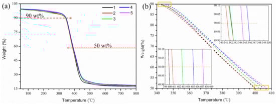TGA curves of pure EP and EP/GR-Fe3O4 composites. Curves 1–5 indicate that the mass fraction of magnetic GR in EP is 0.00%, 0.05%, 0.10%, 0.15%, and 0.20%, respectively. (a) Overview of TGA curves; (b) magnified curves between 90 wt.% and 50 wt.%).