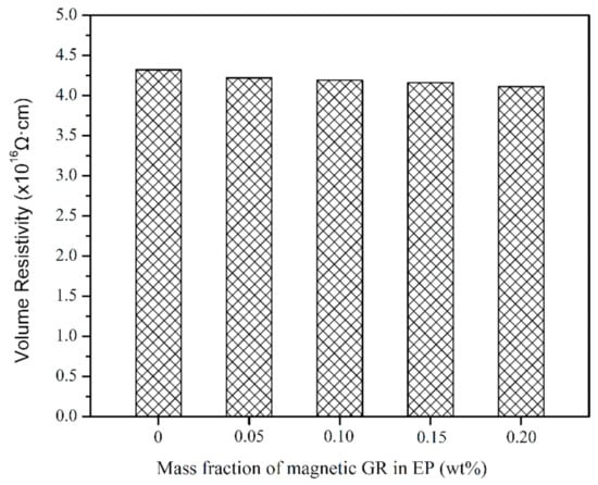 As for thermally conductive composites, the electrical insulation property is also a key factor in electronic packaging. Materials with high electrical insulation can ensure the safety and stability of electronic components []. Figure 11 shows the volume resistivity of EP and EP/GR-Fe3O4 composites as a function of magnetic GR content at 250 V. The volume resistivity of the composites has little difference compared with that of pure EP, which is kept at the same order of magnitude (𝗑 1016 Ω·cm) as that of pure EP. Moreover, none of the composites showed dielectric breakdown at the highest voltage (1000 V). Therefore, the thermal conductivity of the composites is improved on the premise of ensuring electrical insulation.