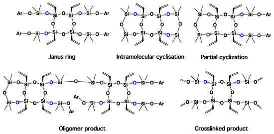 In these reactions, the yields were affected by the purification methods because several byproducts formed as a result of partial intramolecular cyclization, intermolecular reaction, and polymerization, as shown in Figure 1. Owing to the interference of water or hydride migration, intramolecular cyclization took place competitively to partially form 6- or 8-membered cyclic or tricyclic laddersiloxanes as byproducts as shown in Scheme 5 [,,,,,,,].