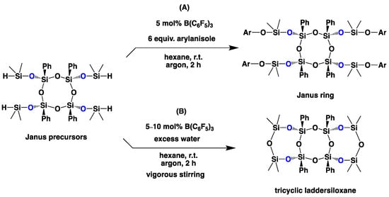 Previous work: (A) The synthesis of the Janus ring [PhSi(OSiMe2OR)O]4 (R = 4-methylphenyl, phenyl, 4-bromophenyl, 4-chlorophenyl, 4-(chloromethyl)phenyl, and 4-allylphenyl) by the Piers–Rubinsztajn reaction. (B) The synthesis of a tricyclic laddersiloxane by the intramolecular cyclization mediated by B(C6F5)3.