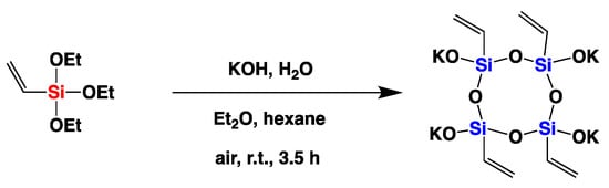 As shown in Scheme 2, triethoxyvinylsilane (14.9 g, 88 mmol) was added dropwise to a round-bottom flask containing KOH (4.9 g, 88 mmol), water (1.6 g, 88 mmol), and hexane (90 mL) at room temperature. After stirring (RCT basic, IKA Japan K. K., Higashi-Osaka, Osaka, Japan) for 3.5 h, a white precipitate was formed. The precipitate was collected, washed with hexane, and dried using a high vacuum pump (G-20DA, ULVAC, Inc., Chigasaki, Kanagawa, Japan) for 1 day to yield potassium all-cis-tetravinylcyclotetrasiloxanolate as a white solid (5.00 g, 50% yield). Please note that this compound is highly hygroscopic and should be kept under an anhydrous atmosphere. In our study, it was used immediately after its preparation. Spectral data: 29Si NMR (methanol-d4) δ = −42.06 ppm.