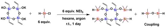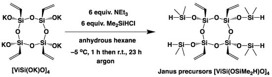 The Janus precursor [ViSi(OSiMe2H)O]4 was prepared by the condensation of vinyl-functionalized potassium cyclotetrasiloxane silanolate all-cis-[ViSi(OK)O]4 with chlorodimethylsilane (Me2SiHCl) according to our previous report [], as shown in Scheme 4. The reaction was conducted under argon atmosphere at low temperature (–5 °C) with the slow addition of Me2SiHCl in the presence of triethylamine (NEt3) to avoid side reactions such as acid-catalyzed isomerization and polymerization. These reaction conditions provided a 90% yield of the pure product ([ViSi(OSiMe2H)O]4), which was confirmed by Fourier transform infrared spectroscopy (FTIR) and nuclear magnetic resonance (NMR) spectroscopy (Supplementary Materials, Figures S1–S51).