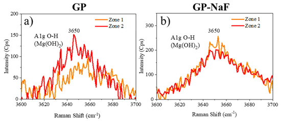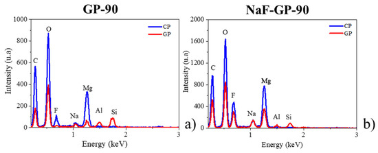 | GP-NaF (Figure 7) | Orange square—image (c) Blue square—image (d) Red square—image (e) zone A zone B | 28.9 ± 0.7 22.5 ± 2.5 21.2 ± 1.8 Not measureable | 10.5 7.9 10.8 Not measurable | 6.5 6.1 9.7 Not measurable |