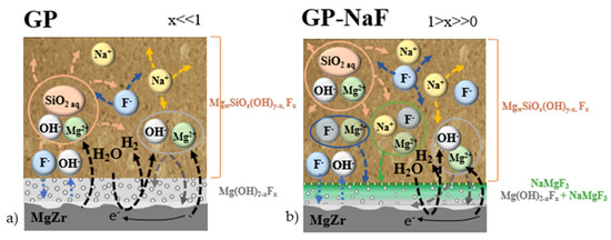 - Barros, C.F.; Muzeau, B.; L’Hostis, V.; François, R. Impact of fluoride concentration on general corrosion of Mg-Zr alloy in a Na-geopolymer and alkaline solutions. Corros. Sci. 2020, 176, 109009. [Google Scholar] [CrossRef]