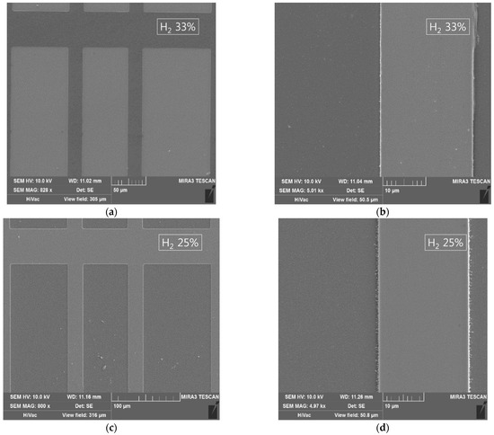For the one-step etching process for the ITO/Ag/ITO multilayered electrode, the concentrations of H2 in the H2 and HCl gas aspects were kept between 17% and 33%. Figure 4 shows SEM micrographs of ITO/Ag/ITO etched using the 17%, 25%, and 33% H2 concentrations. Several 50 um scale images are presented to show the size of the pattern (21 um width lines separated in 50, 75, and 100 um pitches). Because the differences between the samples were not clearly distinguishable at a large scale, 10 um scale images are added to show the remains left over the etched area at lower concentrations of hydrogen gas. A 33% concentration of H2 manifested a clean etch profile with smooth sidewalls. The absence of any undercutting in the etch profile suggests that both the ITO and the Ag were etched at an appropriate rate (1:1.8). The 25% concentration of H2 also manifested a clean etch profile, with approximately the same etch rate (1:1.3); however, some residues were left on the edges. With the 17% concentration of H2, the insufficient presence of hydrogen ions or reactors caused more residue to be left on the substrate surface, with an Ag etch rate lower than that of the ITO (1:0.8). Figure 5 shows the cross-sections of the etched profiles of ITO/Ag/ITO using 17%, 33% and, 50% H2 concentrations taken by Focus Ion Beam Scanning Electron Microscope (FIB-SEM, LYRA3, Tescan, Brno, Czech Republic). The slow Ag etching speed causes residue to be left even if the processing time is increased up to the point at which the etched profile is damaged by the ITO’s side etch. The etching process with an H2 concentration of over 50% led to undercutting between the ITO and Ag layers, or over-etched patterns due to the higher etch rates of Ag thin film (4–31 times faster). The optimized balance led to an appropriate profile without residue or undercutting.