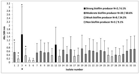 Biofilm-forming capacity of S. aureus clinical strains. The strains of S. aureus were assessed for their ability to form a biofilm and accordingly classified as strong, moderate, weak, and non-producers. Results are expressed as the mean value ± standard deviations of the mean of at least 5 independent experiments performed in triplicate. To classify the strains into groups that showed significant differences, statistical analysis was performed using Student’s t-test (* p < 0.05). The isolate number 3 that formed high levels of biofilm is indicated (◆).